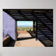 This is a colorful outdoor room of purples and violet. The bright desert sun leaves strong diagonal shadows on the walls which creates interesting patterns. The rough-hewn timbers that frame the doorway create a portal inviting the viewer to step out into the desert landscape that lies in the distance beyond.