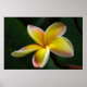 A soft-focus photograph of a beautiful and fragrant yellow plumeria flower set against a dark green background.