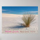 The image captures a serene desert landscape with white sand dunes under a clear blue sky. A clump of green desert yucca plant stands prominently in the foreground, casting a long shadow on the rippled sand. The dunes stretch into the distance, creating a sense of vastness and tranquility. The sky is a bright blue with wisps of white clouds.