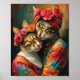 A heartwarming, artistic illustration of two affectionate cats sharing a tender embrace. These adorable feline companions are dressed in vibrant floral outfits adorned with bright orange, pink, and teal flowers. Each cat wears a charming floral headpiece with large blossoms that match the vivid colors of their clothing, adding a whimsical and cheerful touch to the scene. The cats' expressions are serene and joyful, eyes closed as they snuggle together lovingly. Set against a soft, painterly background with warm hues, this artwork exudes a cozy, artistic, and romantic feel.