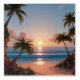 This picture shows a serene tropical beach at sunset. The golden sun is low on the horizon, casting a warm glow across the calm ocean waves. The sky is painted in shades of soft blue, peach, and pink with scattered fluffy clouds. Tall, leaning palm trees frame the sandy shoreline, their trunks surrounded by lush tropical flowers and greenery. The smooth sand carries gentle shadows, adding depth and tranquility to the scene, making it feel like a peaceful paradise.