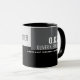 Stylish black and white coffee-mug personalized with your own name, initials and custom profession (designer)... geometric squares at the background... a modern visual concept.