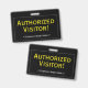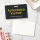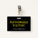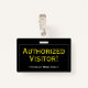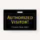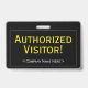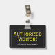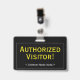 This professional badge design features the message "Authorized Visitor!", and a customizable company name or other custom message. It also features a single-line border. A badge like this could maybe be used to show that somebody at a business or workplace is an authorized guest or visitor. [~Z0000307]