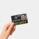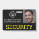 This custom identification badge features a "SECURITY" title printed in yellow across the bottom portion over a black background. A sample security guard photo is placed on the right which you can personalize to include your own photo ID. A sample company or business logo is placed on the left, followed by an employee and company name.