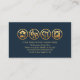 Overleaf, in a dark blue cover, at the top is a gold logo with the four icons followed by your prestigious name, contact details and a slogan option to publicize your services.