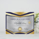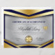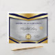 This professional certificate of achievement award features blue and gold, and a grey detailed background. Includes two medal awards: a custom gold and blue medal centered at the bottom with blue stars and a gold medal.