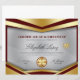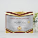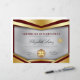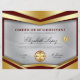 This professional certificate of achievement award features red and gold, and a grey detailed background. Includes two medal awards: a custom gold and red medal centered at the bottom with red stars and a gold medal.