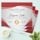 Professional certificate of appreciation award flyer features red wave shapes, light grey background & a shiny gold medal.