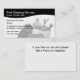 Cleaning service business cards in a professional template design with a graphic lightly printed in the background of cleaning supplies and simple organized layout for a professional house or office cleaning services.