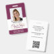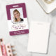 Create a professional appearance with this stylish identification badge. A simple template personalized with your ID photo, name, job title, and company logo. Return details are on the back, along with additional information, and a QR code. All the text can be customized to suit your business needs. This versatile design would suit many different workplaces including corporate professionals, business consultants, retail workers, medical staff and more. Printed colors: purple-pink plum, black and white.