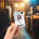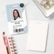 A modern, and professional editable blue nurse photo id badge with logo and barcode.