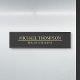This hanging name plate features name and title in gold professional serif font style with gold line in the middle on black background.