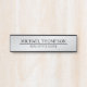 This door sign features name and profession in black professional serif font style with black line in the middle on silver background.