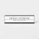 This desk name plate features name and title in black professional serif font style with black line in the middle on white background.