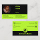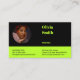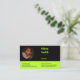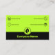 A professional entrepreneur small business card in vivid lime green and black offers placeholders in the form of a round custom logo and company name with custom network symbols to connect and socialize. On the front side are placeholders for a personalized round photo with custom text fields that include name, contact details, and address. Further customization of font, font size, font color, and color of background and shapes are possible. Should you require assistance or want to discuss a custom design, contact https://t.me/KBMD3signs_chat.