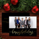 Send warm holiday greetings from your company with this professional Happy Holidays business holiday card. The front features a modern black background with elegant gold script reading “happy holidays” beneath your team photo, framed by festive holiday decorations. The back includes a customizable message in gold text, perfect for thanking clients and partners while wishing them a joyous season filled with peace, prosperity, and happiness. Ideal for businesses wanting to maintain a polished and festive brand image during the holidays.