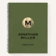 Modern notebook features a minimal design in olive green with metallic gold monogram. Custom name and title presented in stylish simple font with a complimentary brushed gold monogram emblem.