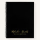 Professional Modern Notebook featuring name in gold modern script font style with custom text in gold modern sans serif font style on black background.