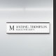 This hanging name plate features monogram with name and title in black professional serif font style on white background.
