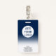 A modern, and professional editable dark blue ombre nurse photo id badge with logo and barcode.
