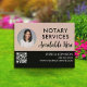 The modern, professional Notary yard sign is a great way to let people know you're in business! The Notary Public QR Code Sign for Business is designed to be very easy to read for quick scanning. Click "Personalize" to customize for your brand. The sign features a round photo with the text "Notary Services Available Here" in modern typography.