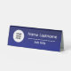 This office desk name plate features a clean and professional layout with space for a logo, full name, and job title. The bold blue background and modern font make the information easy to read from a distance, offering an elegant and business-ready appearance. Printed on durable material for long-lasting quality, it is ideal for corporate offices, reception desks, conferences, events, and workplace identification. The smooth finish ensures a polished look that enhances any workstation or professional environment.