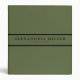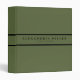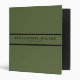 Modern three ring binder features a simple design in a stylish olive green color palette with black accents. Custom name presented in an olive green banner with a double black stripe with coordinating accents.
