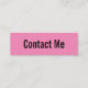 This mini pink business card says 'contact me' on the front of the business card. The back has four lines of black display text for your name and contact information such as your phone number, email address, and/or social media handle. All text can be edited or deleted.