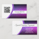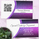 A faux purple glitter sets off the background of this business card design featuring template name and title on the right with QR Code placeholder on the left side. The back includes a coordinated color design with text fields for the business name and details. Replace the placeholder with your QR code on the front. Fill in the template fields or click customize to select a font style, size, and color you like. Use the QR code link to send customers to your website, reviews, photos or other special page.