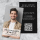 Modern business card with your photo overlayed with your profession and name in bold and trendy typography. On the back, add your website url address to create a scannable QR Code and personalize with your contact information in simple white typography on a black background.