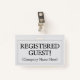 This professional badge design features the message "REGISTERED GUEST!", and a customizable company name or other custom message. It also features a double-line border. A badge like this could perhaps be used to indicate that a person is a known and authorized guest or visitor at a business or workplace. [~Z0000307]