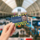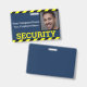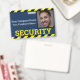 This custom identification badge features a "SECURITY" title printed in a bright yellow font across the bottom portion over a blue background. A black and yellow caution line is printed along the top and bottom borders. A sample security guard photo is placed on the right which you can personalize to include your own photo ID. The company name and employee name are printed to the left of the picture.