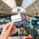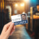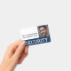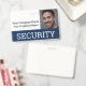 This custom identification badge features a "SECURITY" title across the bottom portion over a blue banner. A sample security guard photo is placed on the right which you can personalize to include your own photo ID. The company name and employee name are printed to the left of the picture.