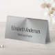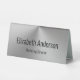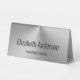 This faux (not foil) silver tabletop sign has black display text that you can edit. There are two lines of text on each side. The top line is for the recipient's name. The bottom line is for their professional title or a custom message such as an organization name.