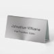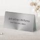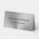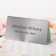 This silver tabletop sign has black display text that you can edit. There are two lines of text on each side. The top line is for the recipient's name. The bottom line is for their professional title or a custom message such as an organization name.