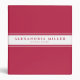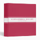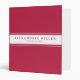 Modern three-ring binder features a simple design in a trendy magenta palette. Custom name presented on a white banner with a double blue stripe with coordinating blue accents and text.
