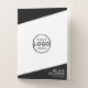 This sleek pocket folder features bold black angled accents at the top and bottom for a modern, polished look. Your company logo sits prominently in the center of the front cover, while customizable lines of text along the bottom can include your name and title, business name and tagline, or any details you choose. Perfect for presentations, client documents, proposals, or corporate use, this folder combines style and professionalism with fully editable text and layout.