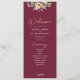 Burgundy colored program for weddings, with watercolor flowers and garden foliage. A simple yet elegant contemporary botanical design inspired by boho vintage style, with monogram on the back.