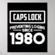 This funny computer science software & web developer design reads "caps lock preventing logins since 1980".