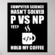 This funny computer science software & web developer design reads "computer science hasn't solved p vs np yet? hold my coffee".The design features a coffee.