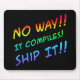 No Way!! It Compiles! Ship It!! - computer programming humor mousepad in black with rainbow lettering.