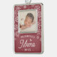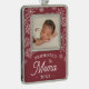 Celebrate his first Christmas as a grandmother with this sweet photo ornament featuring a baby photo framed by falling white snowflakes on a red background. "Promoted to Mema" appears beneath in white rustic lettering, along with the year.