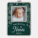 Celebrate his first Christmas as a grandmother with this sweet photo ornament featuring a baby photo framed by falling white snowflakes on a forest green background. "Promoted to Nanni" appears beneath in white rustic lettering, along with the year.