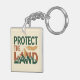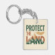 This bold, eco-conscious keychain features the phrase "PROTECT THE LAND" with the word "LAND" incorporating a striking mountain range illustration. The design uses a high-contrast color palette of deep green, rust orange, and gold. A detailed, linework feather floats above the design, adding a powerful, indigenous-inspired element.