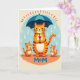 This card shows a large orange striped cat standing under a wide deep-blue umbrella, looking down with a tender, caring gaze ❤️. Two smaller striped cats cuddle close on either side, their relaxed faces and slight lean into the center suggesting trust and closeness like a quiet friendship. The umbrella handle includes a small red heart near the grip, adding a gentle romantic note to the sheltering pose. The background is a soft pale blue with glossy, rounded raindrops falling evenly, more like a light shower than a storm. Above the umbrella, small reddish-orange curved marks float in a loose row, like little accents dancing in the air. Along the bottom, the word “MoM” sits centered in rounded medium-blue letters against a warm peach-colored ground. The illustration has a lightly textured finish that softens the edges and keeps the scene calm 🌼. The deep-blue umbrella spans nearly the full width above the three cats, with pearly raindrops scattered across the sky behind it.
