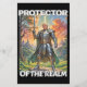 This captivating image depicts President Trump in gleaming armor, standing resolutely with a sword raised high against a vibrant, fantastical backdrop. The "Protector of the Realm," exudes strength and bravery, symbolizing the ultimate guardian of a mystical kingdom. The lush landscape, complete with towering castles and dramatic skies, enhances the epic and adventurous atmosphere, making this image a perfect representation of heroic fantasy.