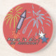 This design features three stars in red, blue and white. "proud to be an American" is printed on this design. A rocket with colorful fireworks are exploding through the skies. This image is available with a white, red or blue backround. Square or round coasters are available.