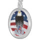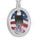 Proud American eagle is set in front of the stars and stripes of the American flag with silver USA text. This is a patriotic design you can be proud to wear.