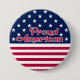 This button features the caption Proud American in a red modern font on a USA flag background with stars and stripes in red, white, and blue.