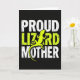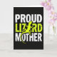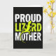 This card features a deep black background with three stacked lines of large text, arranged to read “PROUD” on top, “LIZARD” in the middle, and “MOTHER” on the bottom. The top and bottom words are set in chalky white with a worn, speckled texture, giving them a slightly rough, lived-in look. The middle word “LIZARD” is in bright lime green, and a matching green reptile silhouette stretches across the letters as if it’s crawling through them with an affectionate, clinging closeness ❤️. Its slim body and splayed legs sit over the center of the word, while the long curling tail sweeps downward, creating a gentle, linking motion that feels like a friendly nuzzle between the lines. All the lettering is centered, with the green word drawing the eye first and the white words anchoring the design above and below 🌼. Subtle black edging around the green reptile helps define its shape against the glowing green text. The texture appears across the white and green elements, with tiny speckles and distressed patches scattered over each letter and along the reptile’s tail.